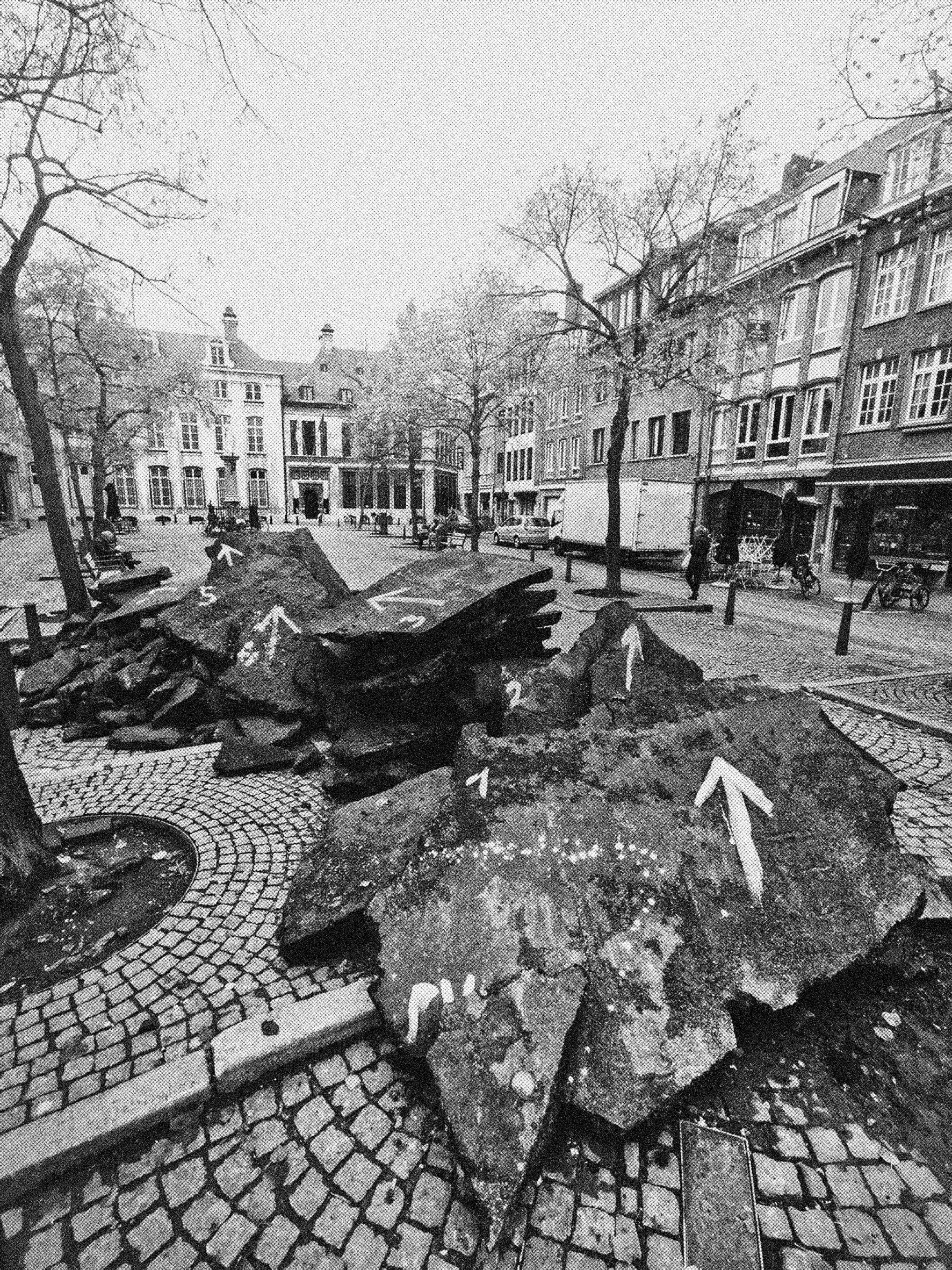 2020 / intervention / Vrijdagmarkt, Antwerp (BE) / chalk on debris, 400 × 800 cm
