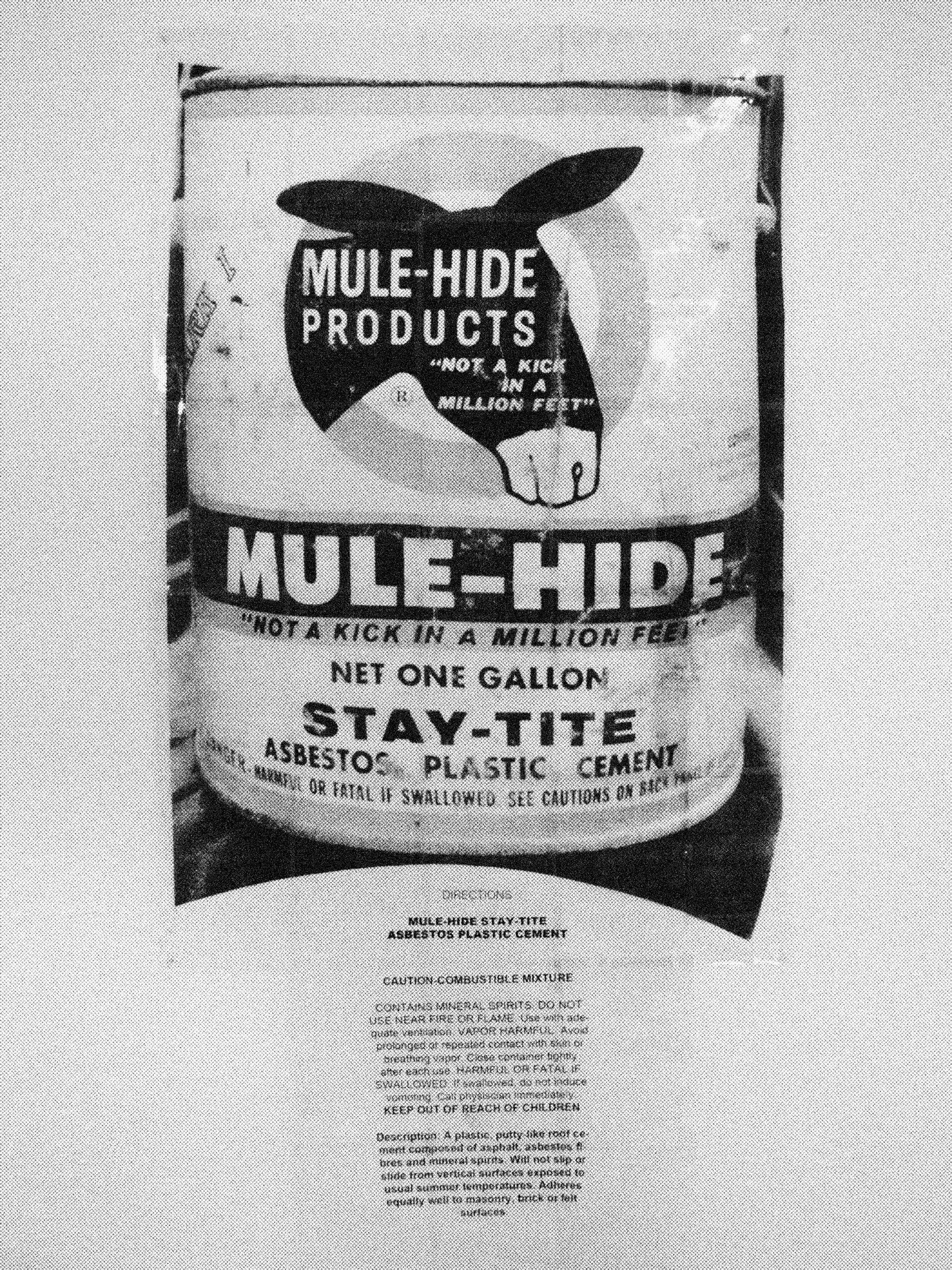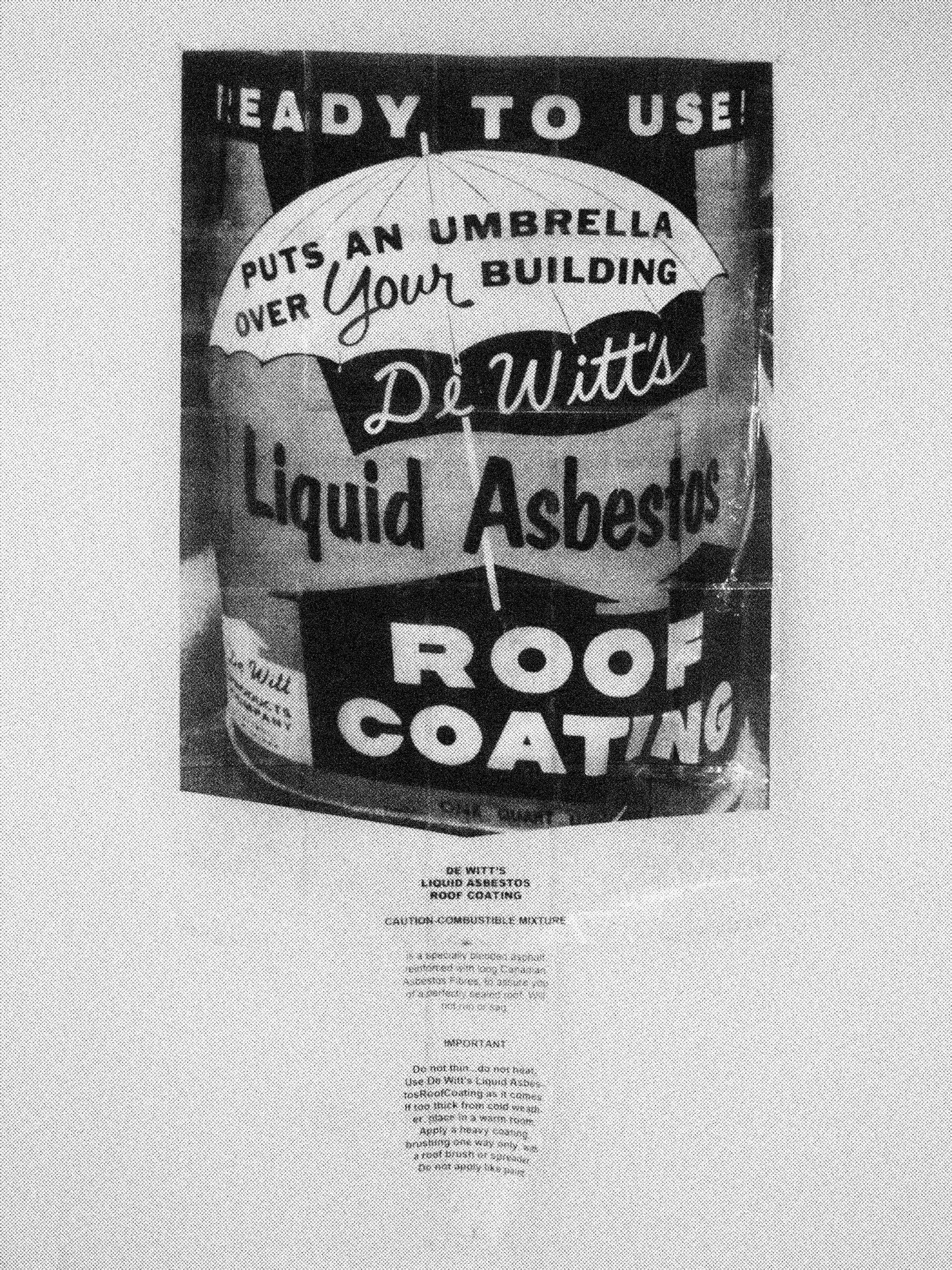 A collection of works representing the different stages that asbestos goes through. The exhibition starts off with a photo collage, part of a series of 12 collages showing different types of asbestos minerals collected from different mines. On the righ side of the collage are three works showing products from the 1950s and 60s containing asbestos. Next, there is a representation of a cracked and crumbling wall, with white dust forming inside its cracks, and a sculpture representing the way asbestos gets removed from various locations. Finally, there is a photo documenting a fictive intervention and performance with white dust.
