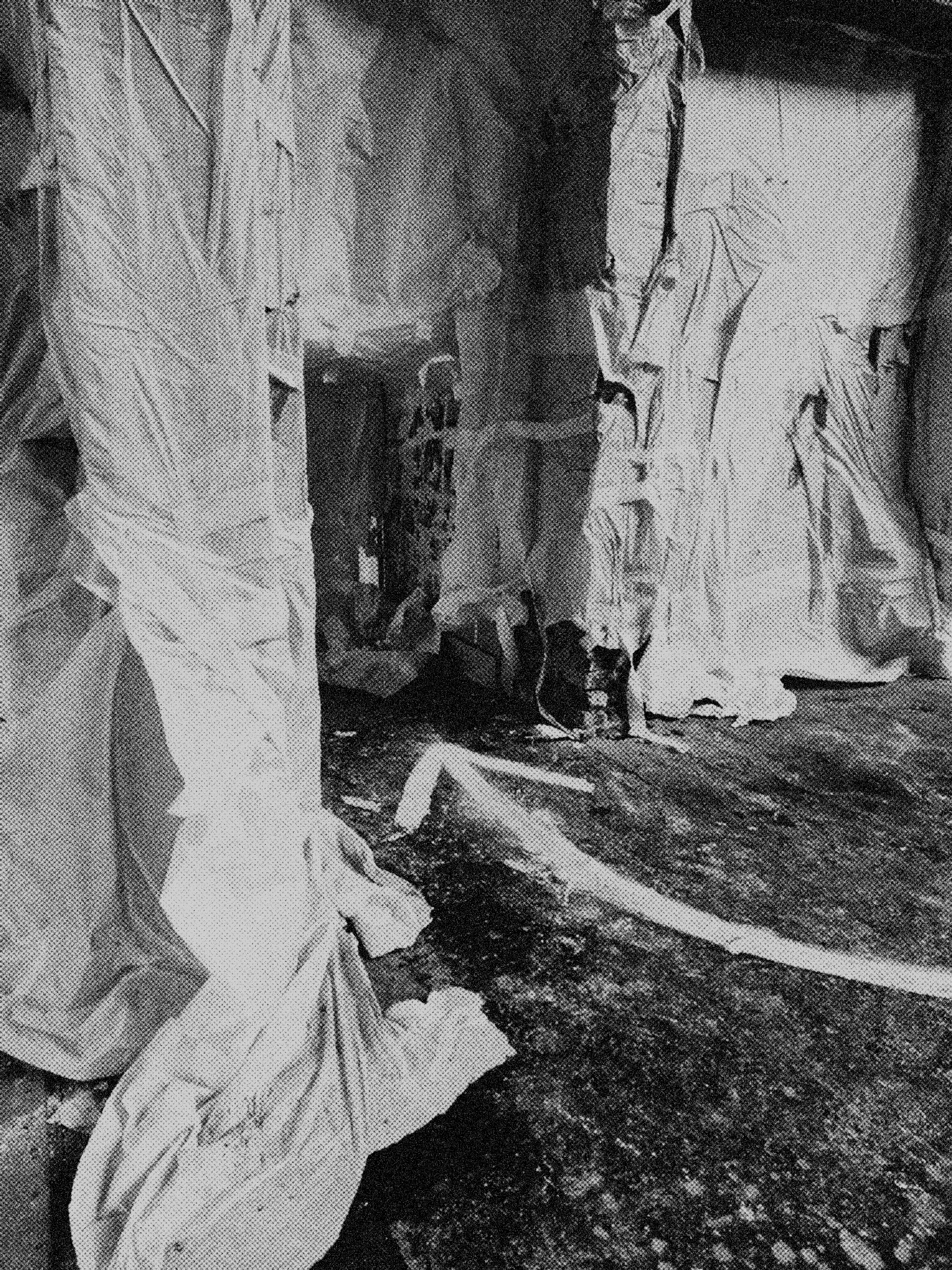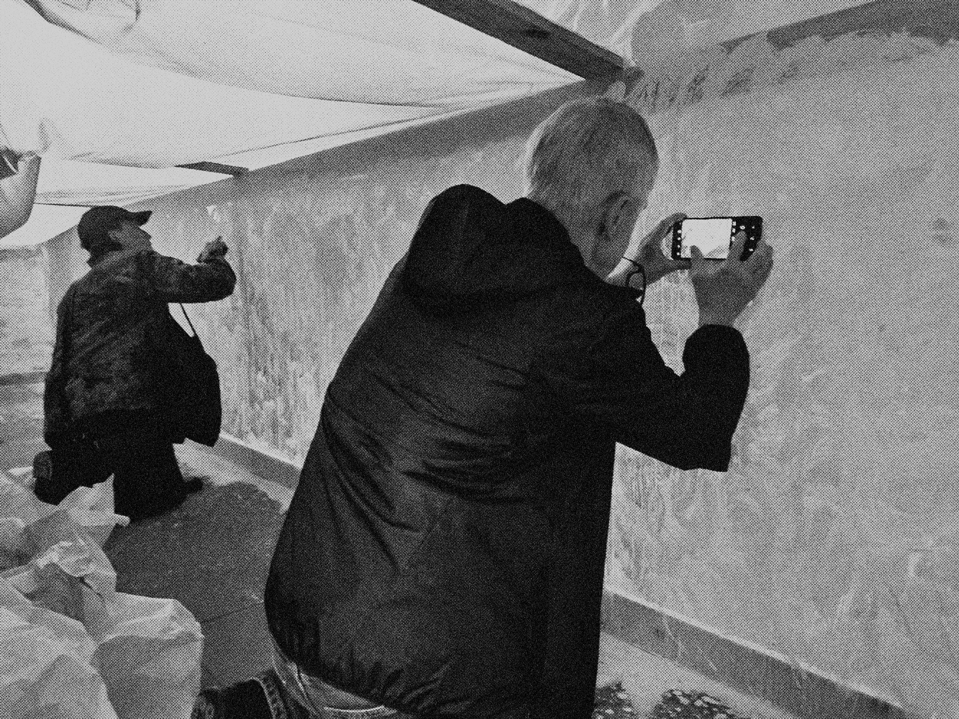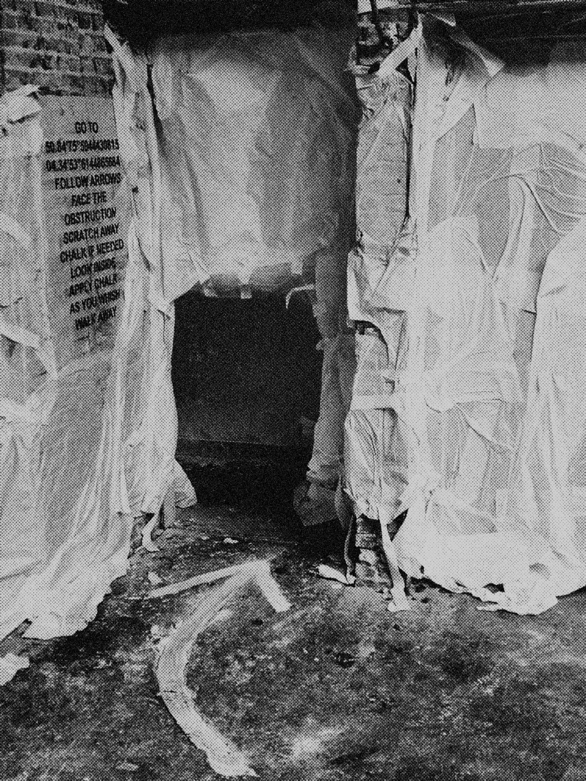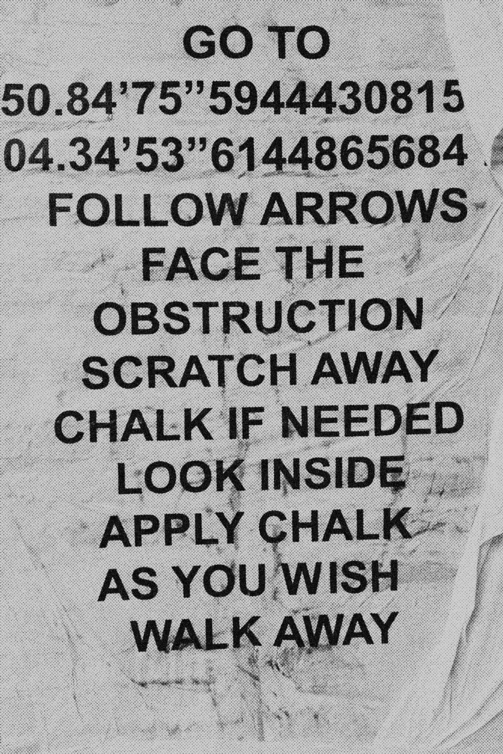 In this work, the artist returns to the work process used in his ‘interference’ interventions. He creates a space filled with blank posters abstracted from Ben-Day dots. Markings on the floor lead the public to two entrances built into the poster-covered walls to crawl through. They lead into a tunnel constructed out of acrylic glass covered in chalk. Due to the chalk, the public is prevented from seeing the actual intervention behind the glass, but they are encouraged in some adjoining text to scratch it away to be able to gaze inside. What lies behind is a timeframe or reenactment of one of the artist’s earliest intervention pieces.