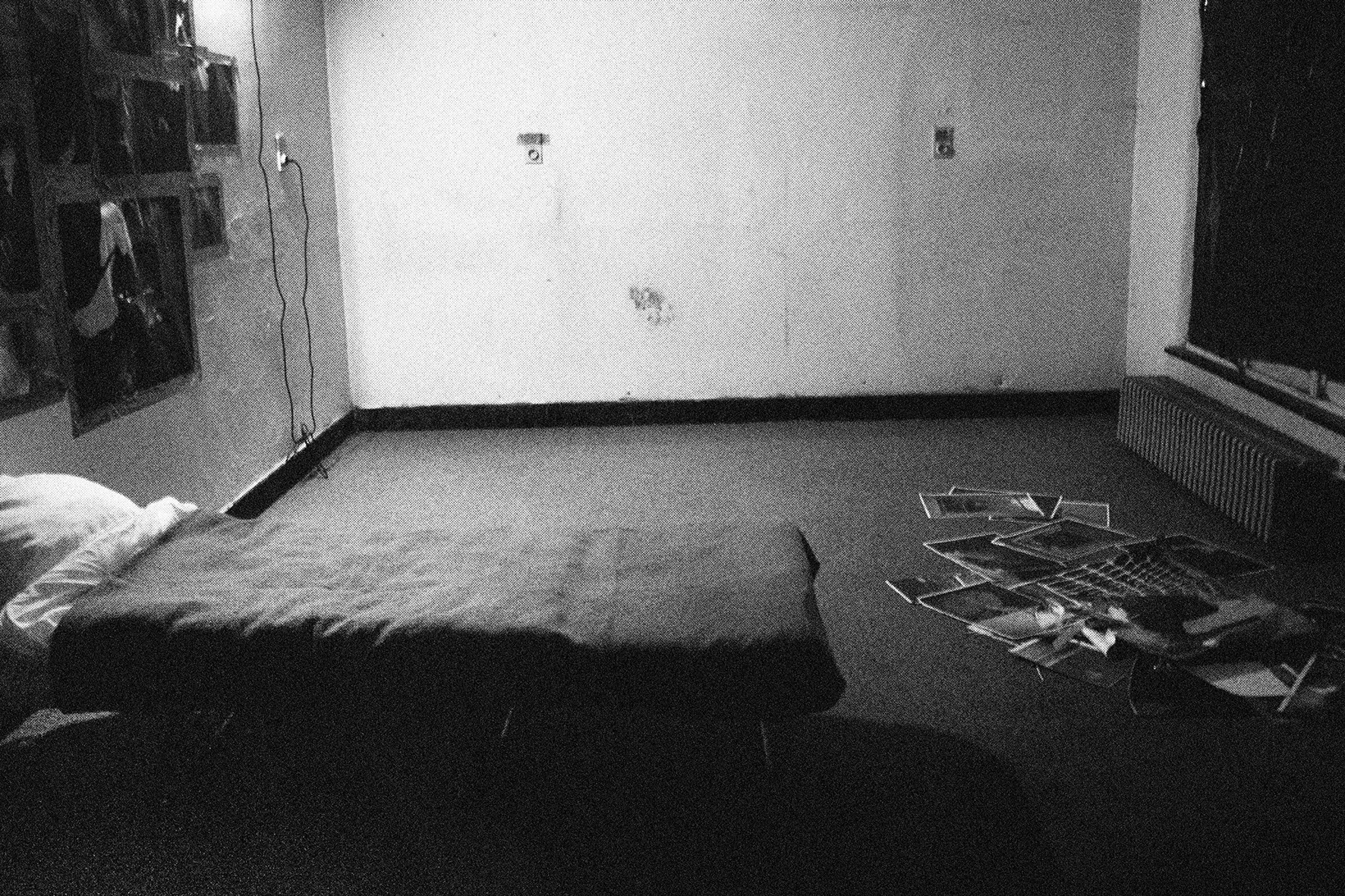 2006 / site-specific installation / Vierkante Zaal, Sint-Niklaas (BE) / carpet, bed, sheets, laser prints, tape, chain, lock / 400 × 600 × 300 cm